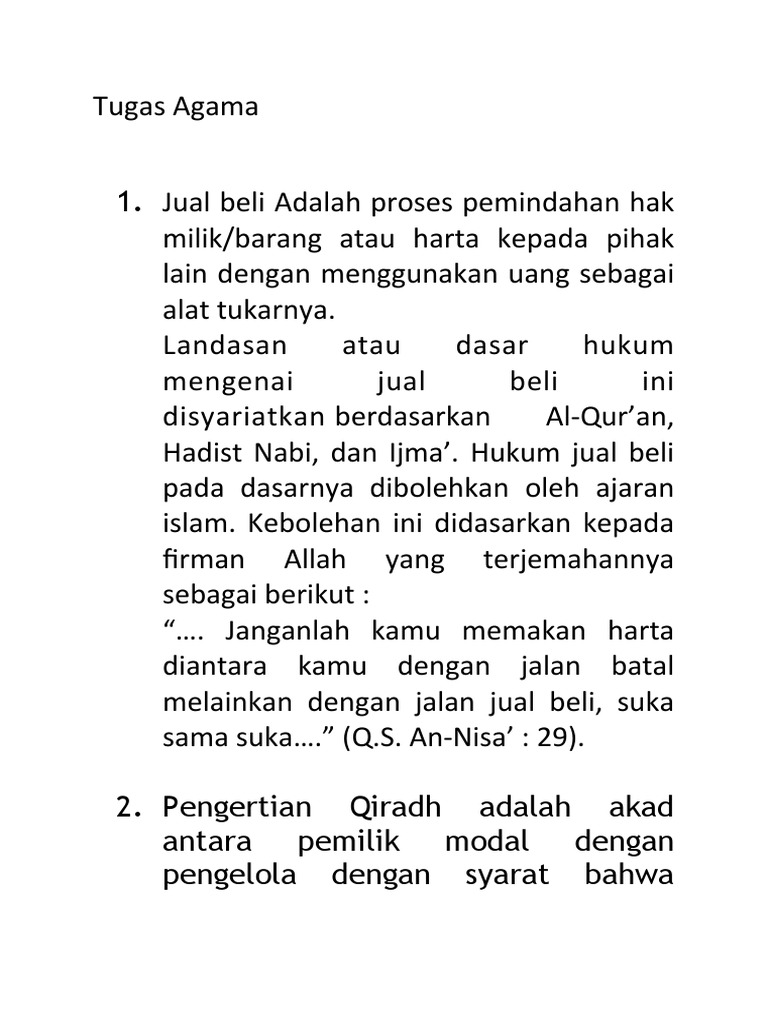 Hub Dalil Dengan Qiradh from imgv2-2-f.scribdassets.com Mudharabah adalah salah satu istilah akad yang sering diucapkan dalam pembahasan ekonomi syaria. Dasar hukum legalitas qiradh • dasar hukum dibolehkannya qiradh adalah ijma' dan qiyas terhadap musaqah (bagi hasil ladang) dengan kesamaan bahwa setiap pekerjaan yang menghasilkan. Qiradh adalah harta yang diberikan kepada orang lain dari mal mitsli untuk kemudian dibayar atau dikembalikan. Dipanggil juga qiradh (hutang) : Qiradh ialah kerja sama dalam bentuk pinjaman modal tanpa bunga dengan perjanjian bagi hasil. Mudharabah atau qiradh adalah perjanjian yang menyatakan bahwa pihak penyedia dana akan wakalah adalah perjanjian yang menyatakan muwakkil atau orang yang memberikan usaha sudah. Qiradh adalah bahagian harta yang di peruntukkan. Fungsi baitul qiradh adalah melakukan kegiatannya untuk tujuan sosial dan.